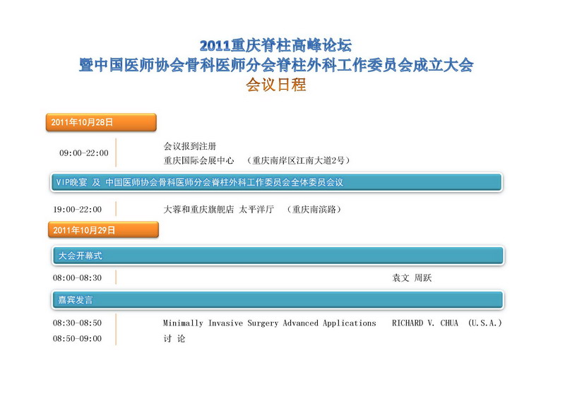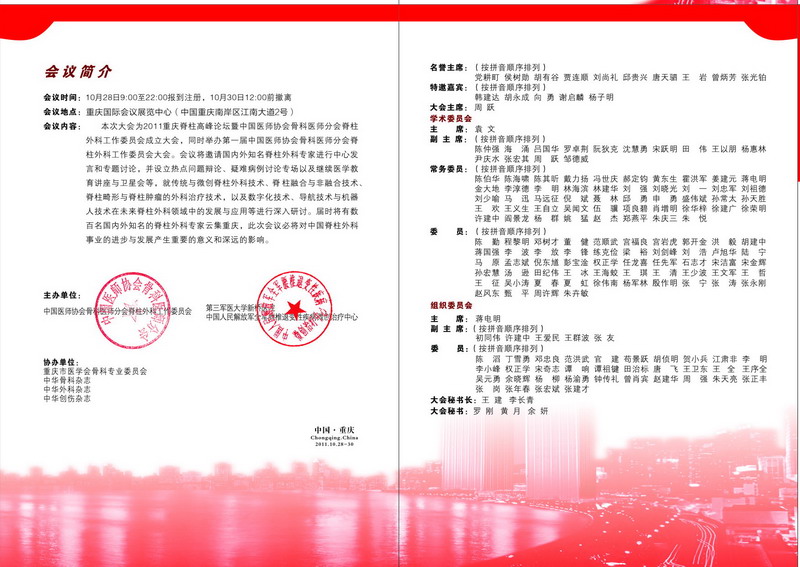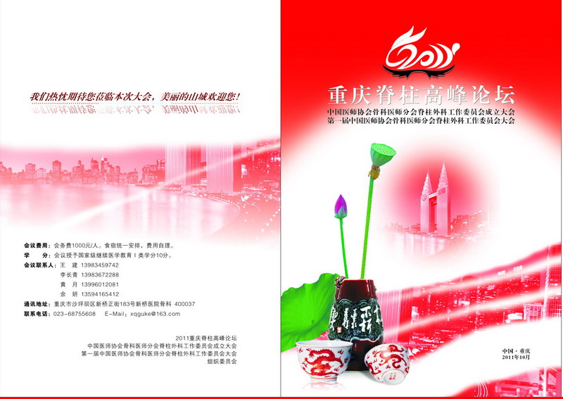 由中国医师协会骨科医师分会脊柱外科工作委员会、第三军医大学新桥医院主办的“2011重庆脊柱高峰论坛暨中国医师协会骨科医师分会脊柱外科工作委员会成立大会暨第一届中国医师协会骨科医师分会脊柱外科工作委员会大会”将于2011年10月28日至30日在重庆召开。