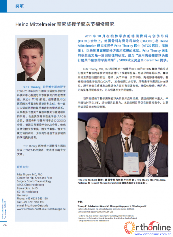 奖 项:Heinz Mittelmeier研究奖授予髋关节翻修研究