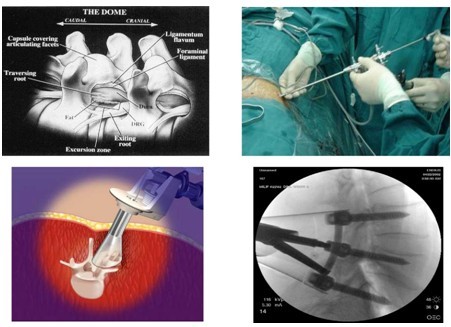经皮椎间孔镜下腰椎间盘切除术是经后外侧入路,通过椎间孔“安全三角工作区”进入椎间盘。该区位于纤维环的后外侧,可允许器械安全通过而不至于损伤出行神经根( Exiting nerve root )。后外侧经皮椎间孔镜下微创椎间盘切除术局麻下操作,这样手术者可以在置入工作通道时获得患者的直接反馈以避免损伤神经根。尽管该手术的优势显著,如极少的出血、微小手术创伤与瘢痕,但仍存在一些缺陷。如患者髂嵴位置较高,或患者的椎间隙已塌陷,就很难找准通道的精确置入点。而且当椎间盘碎片已经游离,则手术操作比较困难。对于需要全麻或深度镇静的患者,神经根损伤的风险也较高。