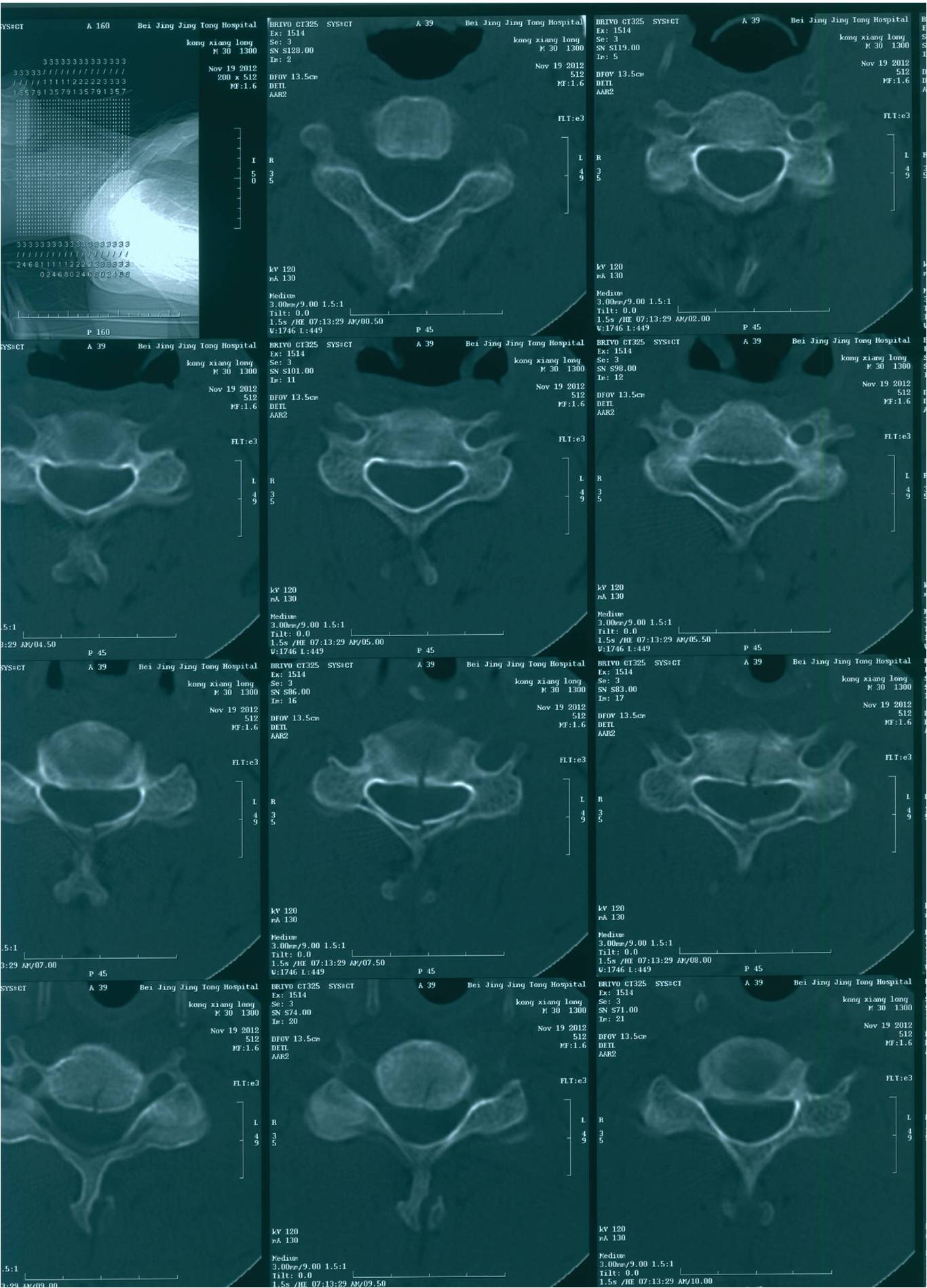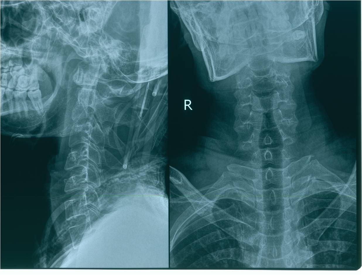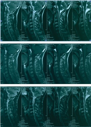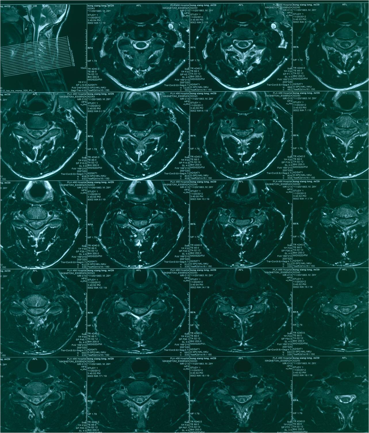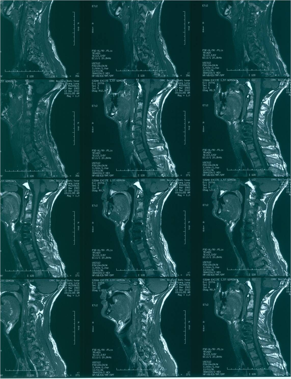 查体:意识清楚,呼吸均匀,查体合作。双侧感觉平面颈4,运动平面颈5. 颈6以下轻触觉保留至肛周,针刺觉消失。颈5以下只有肛门括约肌保留运动功能。下肢肌张力0级。腱反射消失。球海绵体反射可引出。当地医院行X片、CT、MRI检查