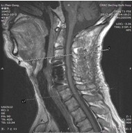 查体:右侧中指轻触觉、针刺觉减退,左侧上肢及双下肢感觉正常。 肌力:指屈肌群 左/右=5/4级,小指外展肌 左/右=5/4级。双侧膝腱反射亢进。双侧hoffman征阳性。肛门深感觉、自主肛门括约肌收缩存在。
