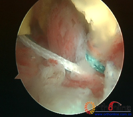 男性患者,35岁,自由职业者。右肩外展位扭伤后疼痛5年,关节活动受限。查体:右肩外展受限,肱骨大结节压痛(+),前恐惧试验(+)。右肩MRI检查示:冈上肌肱骨大结节止点处撕裂。