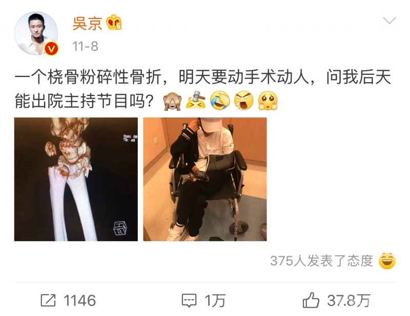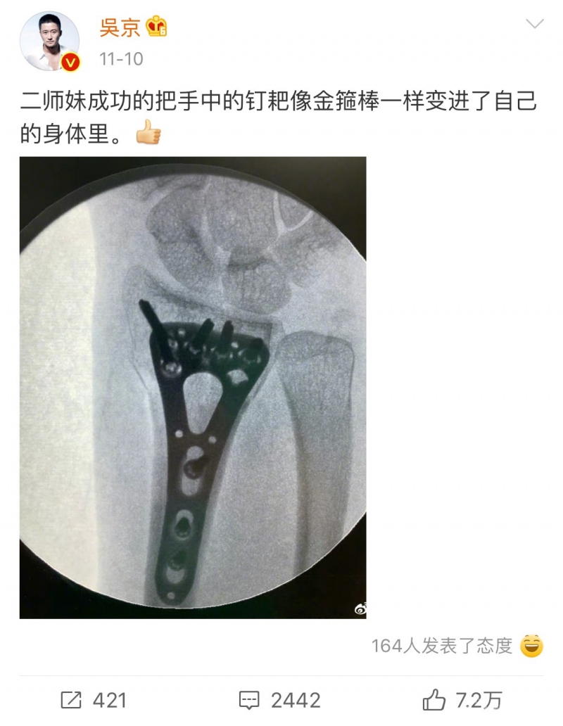 近日,演员吴京在某社交平台发布消息称,妻子谢楠因桡骨粉碎性骨折将入院手术,此事一经发布,引得无数网友关注。在谢楠手术结束后,吴京也不忘晒图,并称“二师妹成功把钉耙像金箍棒一样变进了自己的身体里”。