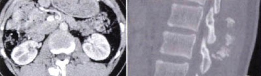 ,16岁。腰背部疼痛1周入院。患者于1周前无明显诱因出现腰部隐痛、钝痛,持续性、渐加重。无发热.咳嗽咳痰。无腹痛腹泻。无肢体麻木及大小便障碍。既往体健,家族史无特殊。人院查体:生命体征正常。专科检查:脊柱呈生理性弯曲,T12~L2棘突及右旁明显压痛、叩痛,T12~L2棘突右旁扪及一鸡蛋大小包块,压痛,质硬,固定。余正常。入院平扫及增强CT示:T12~L1段右侧竖脊肌内软骨类肿瘤可能(图1a~1c)。积极准备在复合全麻下行肿瘤切除术。术中见:T12~L2水